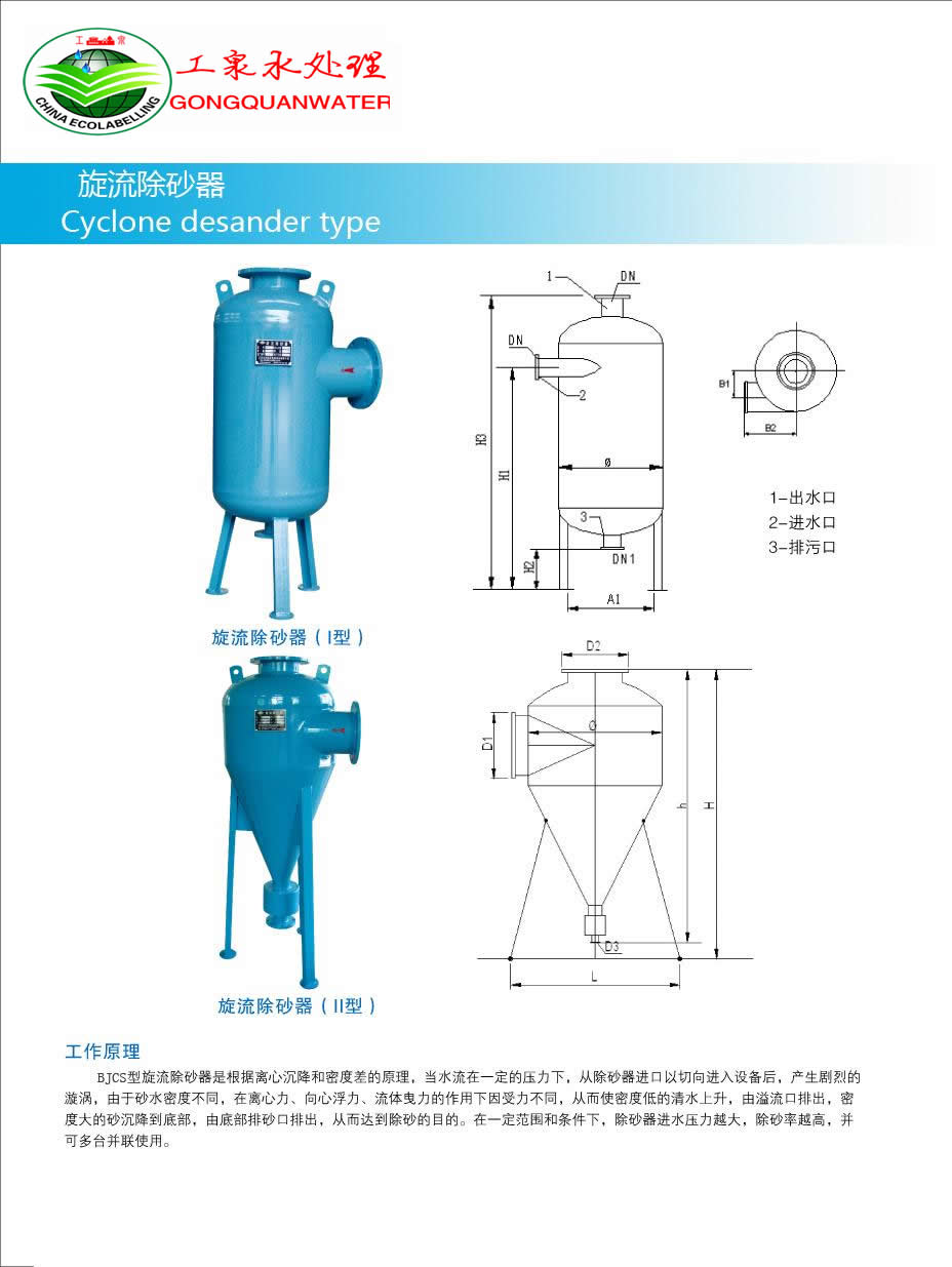GQ系列旋流除砂器的特點: 1、結(jié)構(gòu)簡單,操作簡便,使用安全可靠,幾乎不需維護。 2、與擴大管、緩沖箱等除砂設(shè)備相比,具有體積小,處理能力大,節(jié)省現(xiàn)場空間等優(yōu)點。 3、可在不間斷供水過程中清除水中的砂粒。 4、避免了其他除砂方式存在水質(zhì)二次污染的現(xiàn)象,除砂效率高。