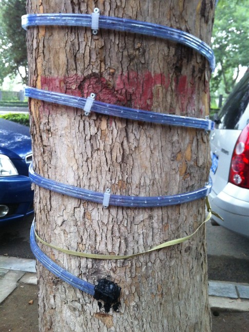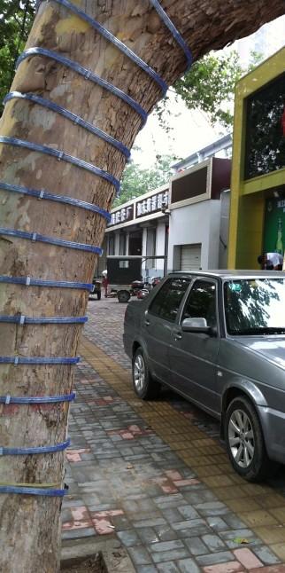 石家莊匯通路上一商家給門前的多棵法國梧桐樹纏上了燈帶,并以釘釘子的方式加以固定。每棵樹的樹身均密密麻麻地遍布釘子, 據“屌絲變學霸”目測,每棵樹至少被釘30顆釘子。